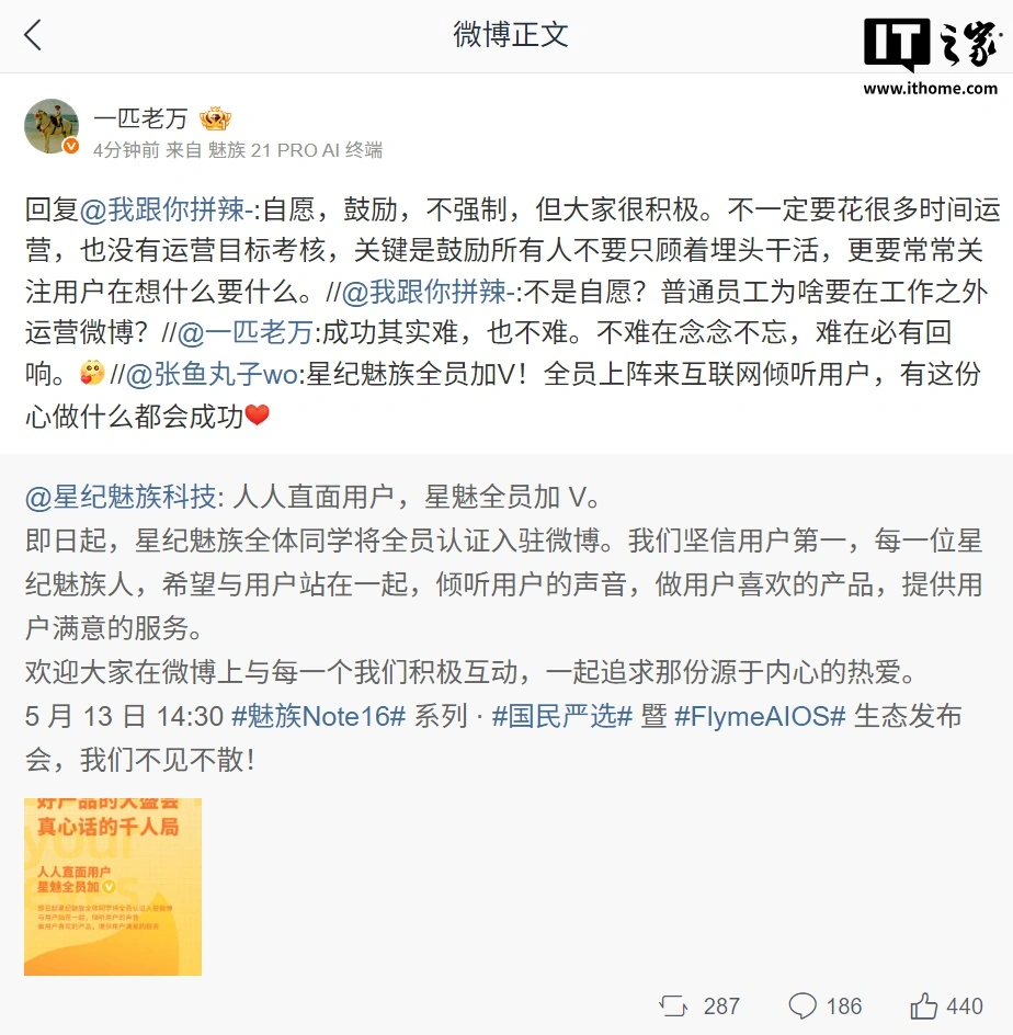 IT之家 5 月 6 日消息,星纪魅族科技今日宣布全员认证入驻微博: