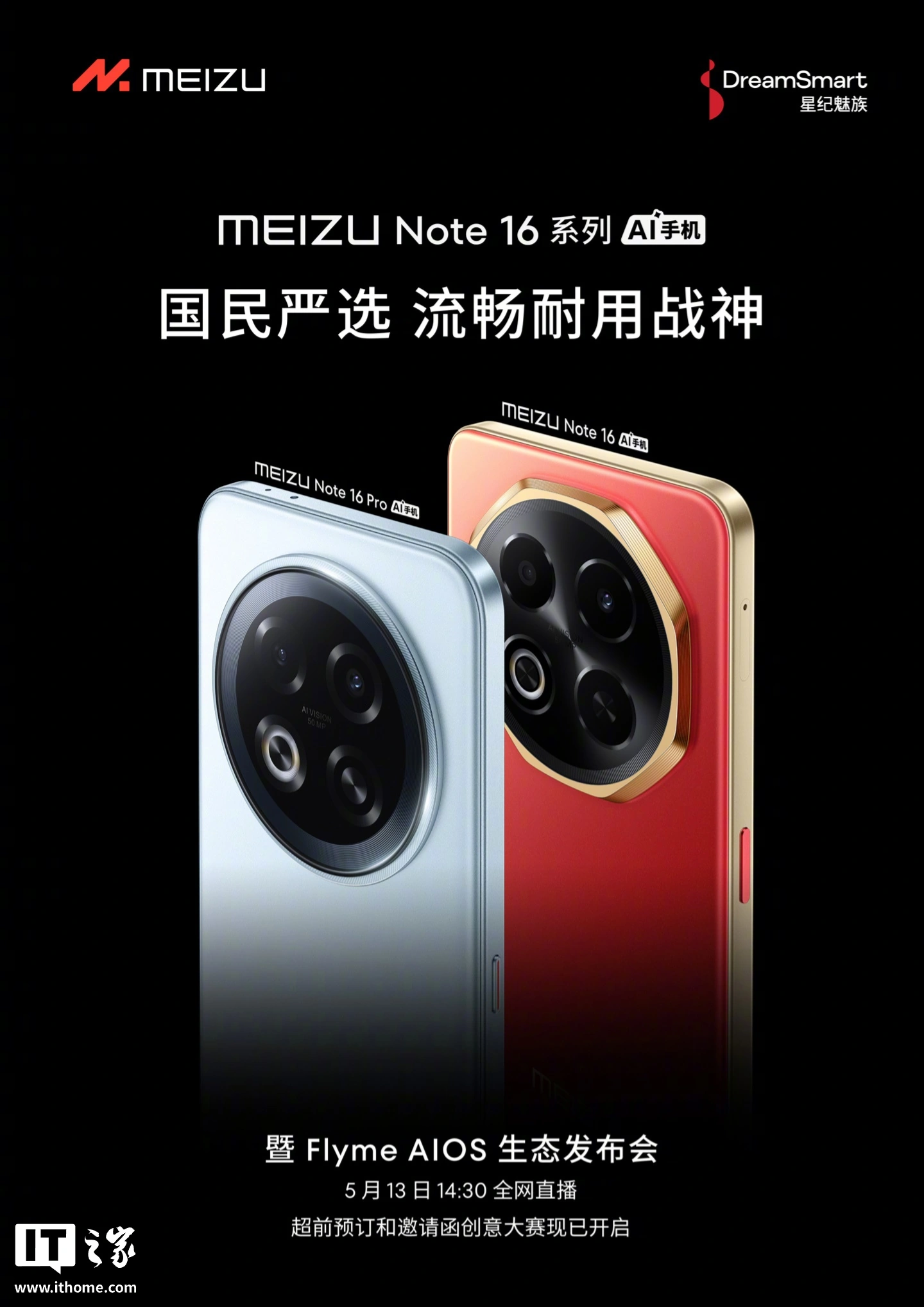 据IT之家此前报道,星纪魅族科技官方今日宣布:魅族 Note 16 系列 国民严选暨 FlymeAIOS 生态发布会定档 5 月 13 日 14:30 全网直播。预计届时将带来星纪魅族 Note 16 系列 AI 手机、Flyme AIOS 2 系统(Flyme 12)。